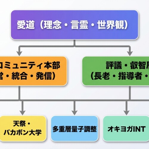 愛道が掲げる組織図の構成です。 幅広く、愛について学び、体感し、共に成長できる環境を構築していきます。