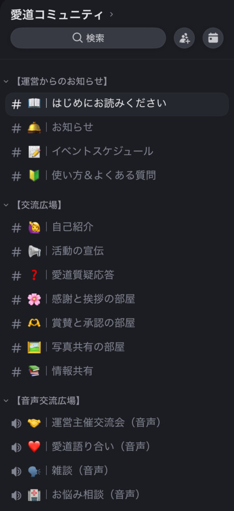 チャンネル利用のコツ: 初心者の方は、まず「はじめにお読みください」チャンネルでルールを確認し、「自己紹介」チャンネルで挨拶をすることから始めてください。その後、「感謝と挨拶の部屋」で日常的な交流を楽しみ、慣れてきたら「愛道質疑応答」や音声チャンネルでより深い交流に参加していただけます。