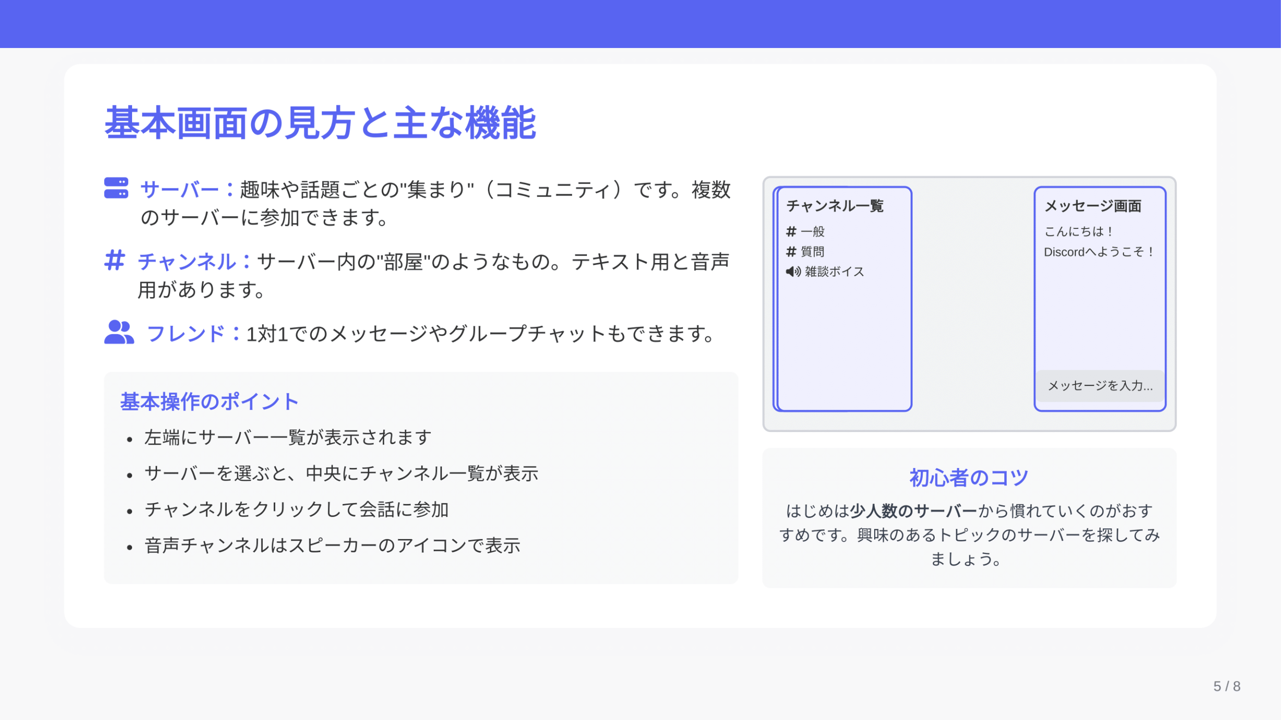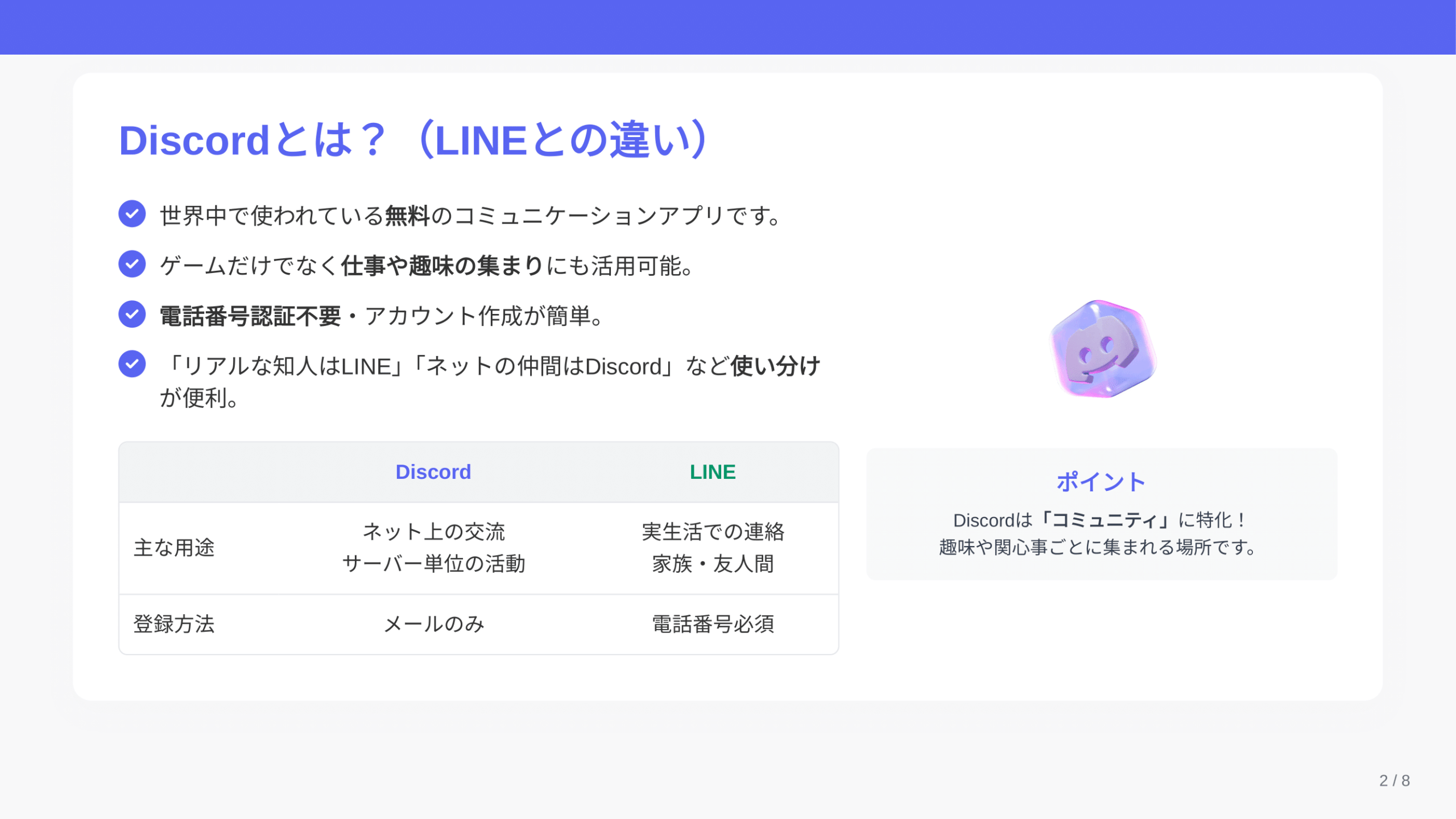Discordは、LINEとは少し異なる特徴を持つコミュニケーションツールです。LINEが家族や友人との日常的な連絡に適しているのに対し、Discordは「コミュニティ」での交流に特化しています。