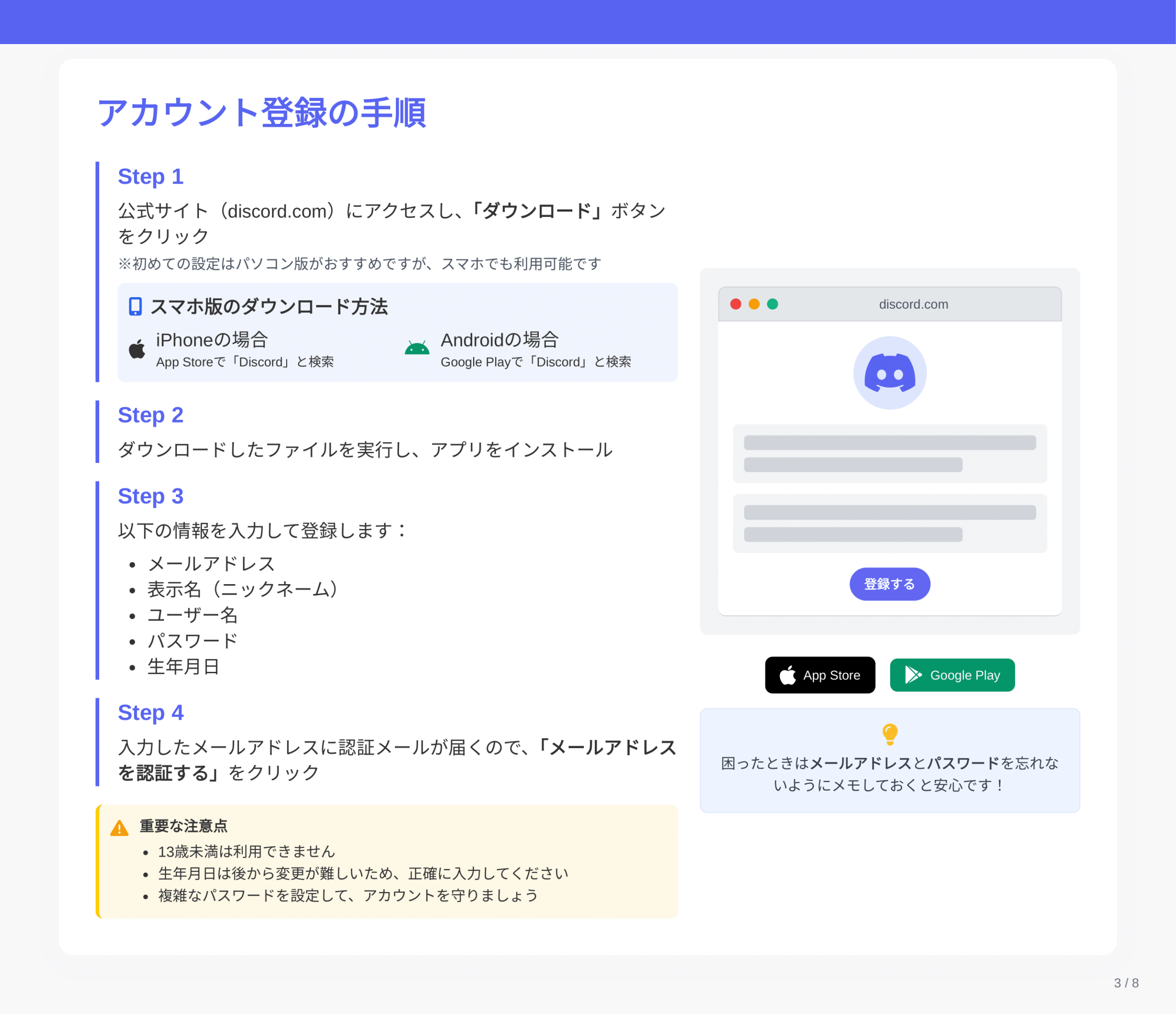 登録時の大切なポイントは、13歳未満の方は利用できないこと、そして生年月日は後から変更が困難なため正確に入力することです。また、アカウントの安全を守るため、複雑なパスワードを設定し、メールアドレスとパスワードは忘れないようメモしておくことをお勧めします。