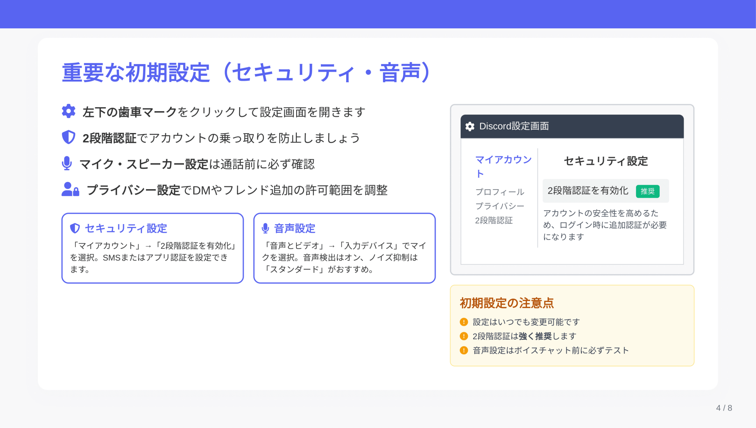 プライバシー設定: DMやフレンド追加の許可範囲を調整することで、快適にコミュニティ活動に参加できます。これらの設定はいつでも変更可能ですが、最初に適切に設定しておくことで、安心してDiscordを利用できます。