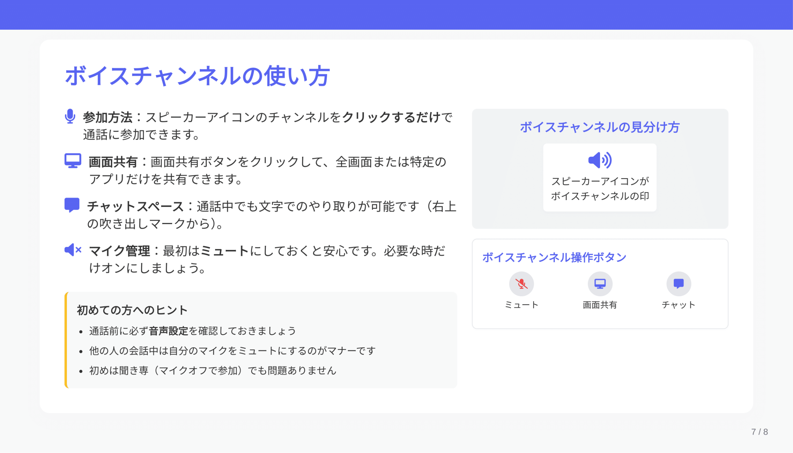 参加方法と基本操作: スピーカーアイコンのチャンネルをクリックするだけで、簡単に音声通話に参加できます。画面共有機能を使えば、愛道に関する資料を見ながらの勉強会や、ヨガのポーズを画面で共有しながらの実践も可能です。