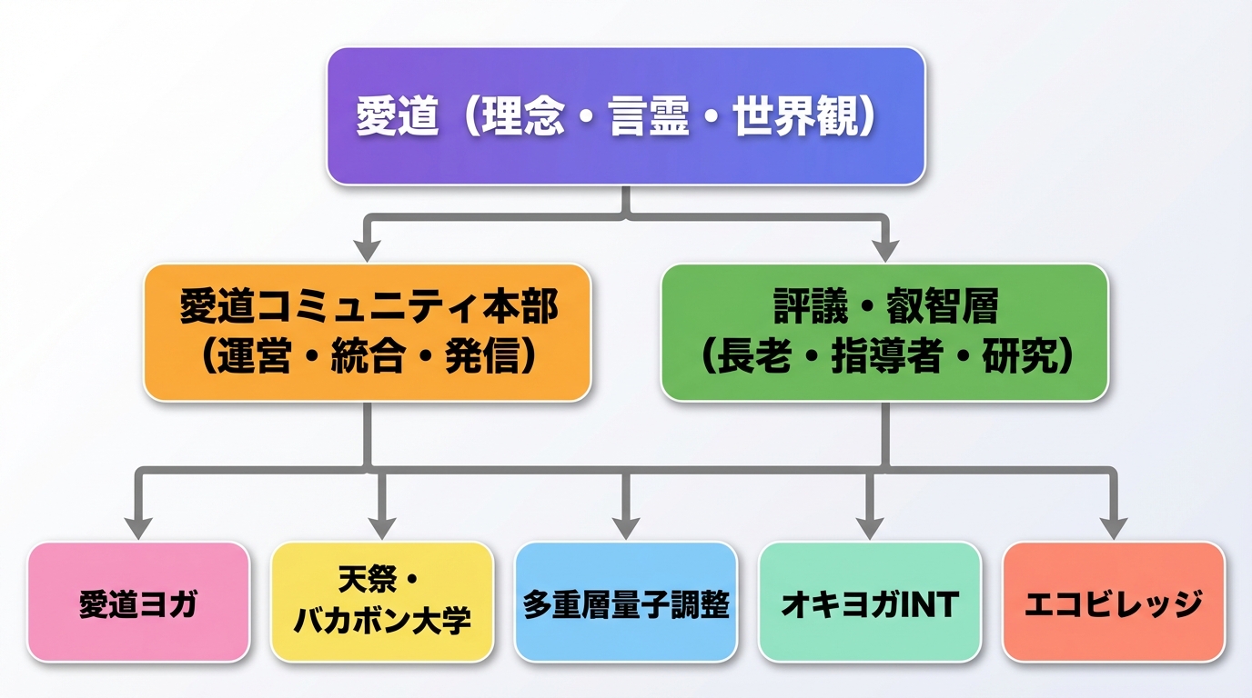 愛道コミュニティが掲げる組織図 2026.01.21 お知らせ 愛道が掲げる組織図の構成です。 幅広く、愛について学び、体感し、共に成長できる環境を構築していきます。 お知らせ, 会員限定ブログ 【イベント情報】🌸 愛道コミュニティ発足イベント in 伊豆 幼少期の体験について 関連記事一覧 鷲巣 誠プロフィール 2025.07.21 光がひらくウサギの声 ― エネルギーが導いた小さな命の回復 2025.11.28 愛道とは何か 2025.08.08 愛道コミュニティ運営メンバー紹介動画 2025.12.21